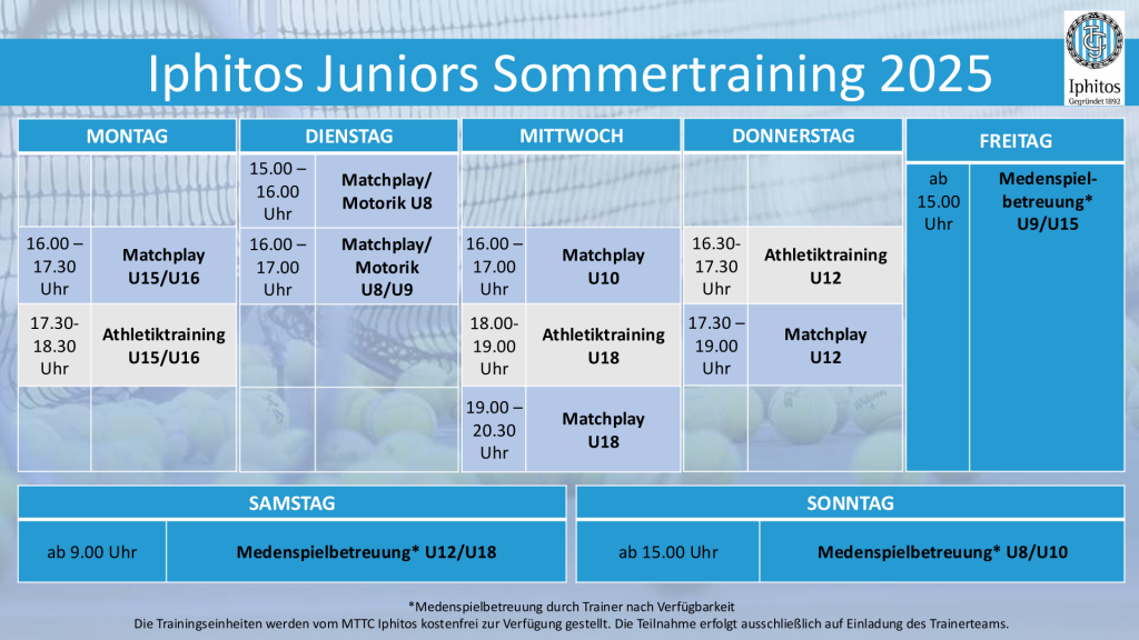 Alle Trainingseinheiten werden vom MTTC Iphitos kostenfrei zur Verfügung gestellt. Die Teilnahme erfolgt AUSSCHLIEßLICH per Einladung/Zuteilung