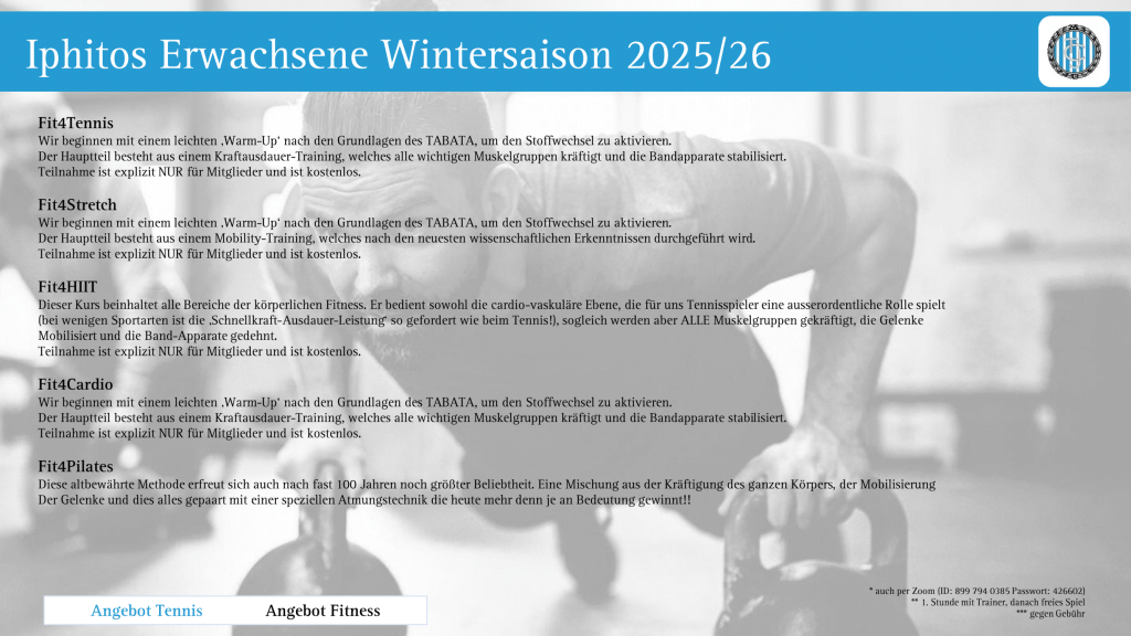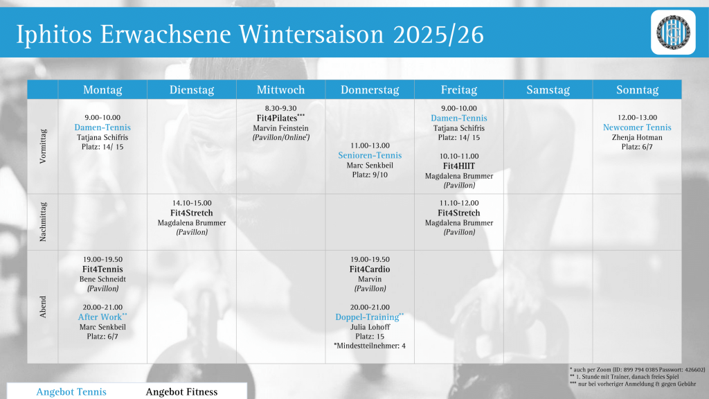 This year there are again numerous courses on offer for the 2025/2026 winter season. The course fees for adults are between 10 and 15 euros. If you have any questions about the individual courses or about joining the Whatsapp groups, you can contact the coaches or the tennis school at any time.