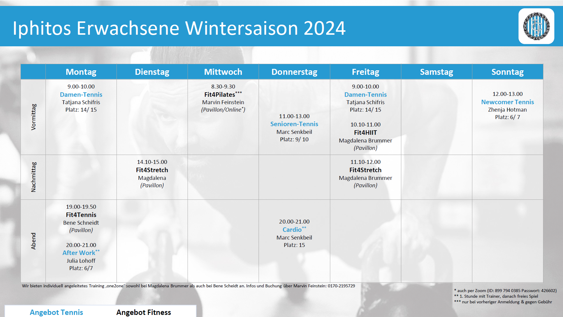 This course covers all areas of physical fitness. It serves both the cardio-vascular level, which plays an extraordinary role for us tennis players (in few sports is the ‘speed-strength-endurance-performance’ as required as in tennis!), but at the same time ALL muscle groups are strengthened, the joints mobilized and the band apparatus stretched. Participation is explicitly ONLY for members and is free of charge.