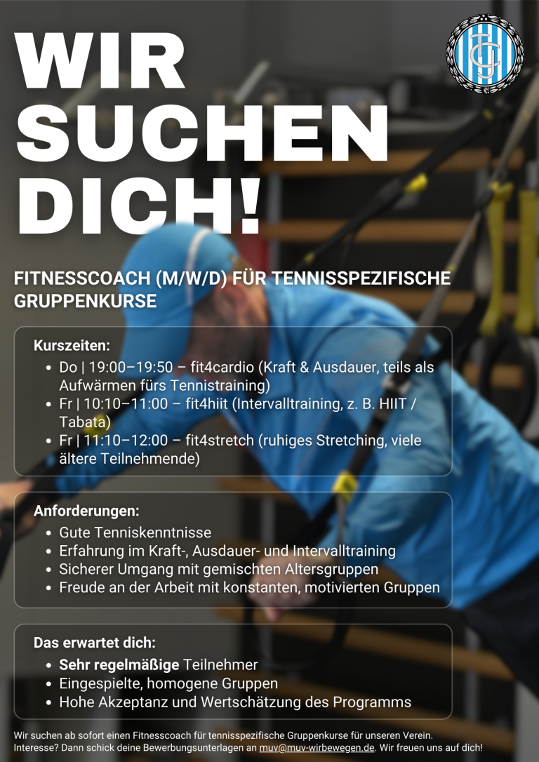 We are now looking for a dedicated fitness coach (m/f/d) for tennis-specific group courses in our club.