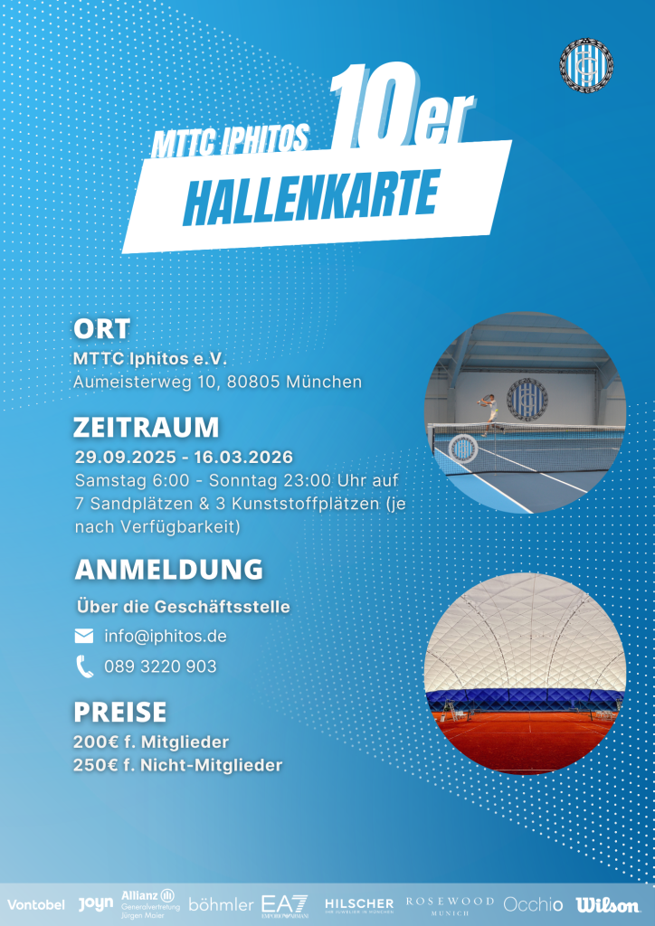Für die Wintersaison 2025/26 bietet der MTTC Iphitos eine 10er Hallenkarte an, die ausschließlich am Wochenende gilt und dabei volle Flexibilität bei der Buchung ermöglicht. Im Zeitraum vom 29. September 2025 bis zum 16. März 2026 können insgesamt zehn Einheiten à 60 Minuten flexibel genutzt werden, jeweils samstags ab 6:00 Uhr bis sonntags um 23:00 Uhr. Auch Doppelstunden sind möglich, sofern Plätze verfügbar sind.