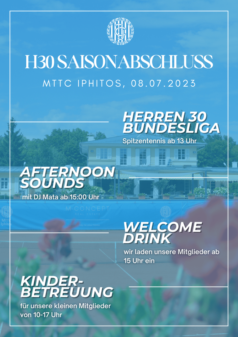 Am Samstag steht für unsere Herren 30 in der Bundesliga das letzte Match der Saison an! Ab 13 Uhr geht es gegen den TC BASF Ludwigshafen. Damit Sie den Saisonabschluss der H30 richtig genießen können lädt der Iphitos alle Mitglieder auf einen kostenlosen Aperitiv ab 15 Uhr ein. Für die richtige Atmosphäre sorgt dabei auch ab 15 Uhr DJ Mata mit einem entspannten Afternoon Set. Wir wünschen Ihnen viel Spaß, der Eintritt ist wie immer kostenlos!