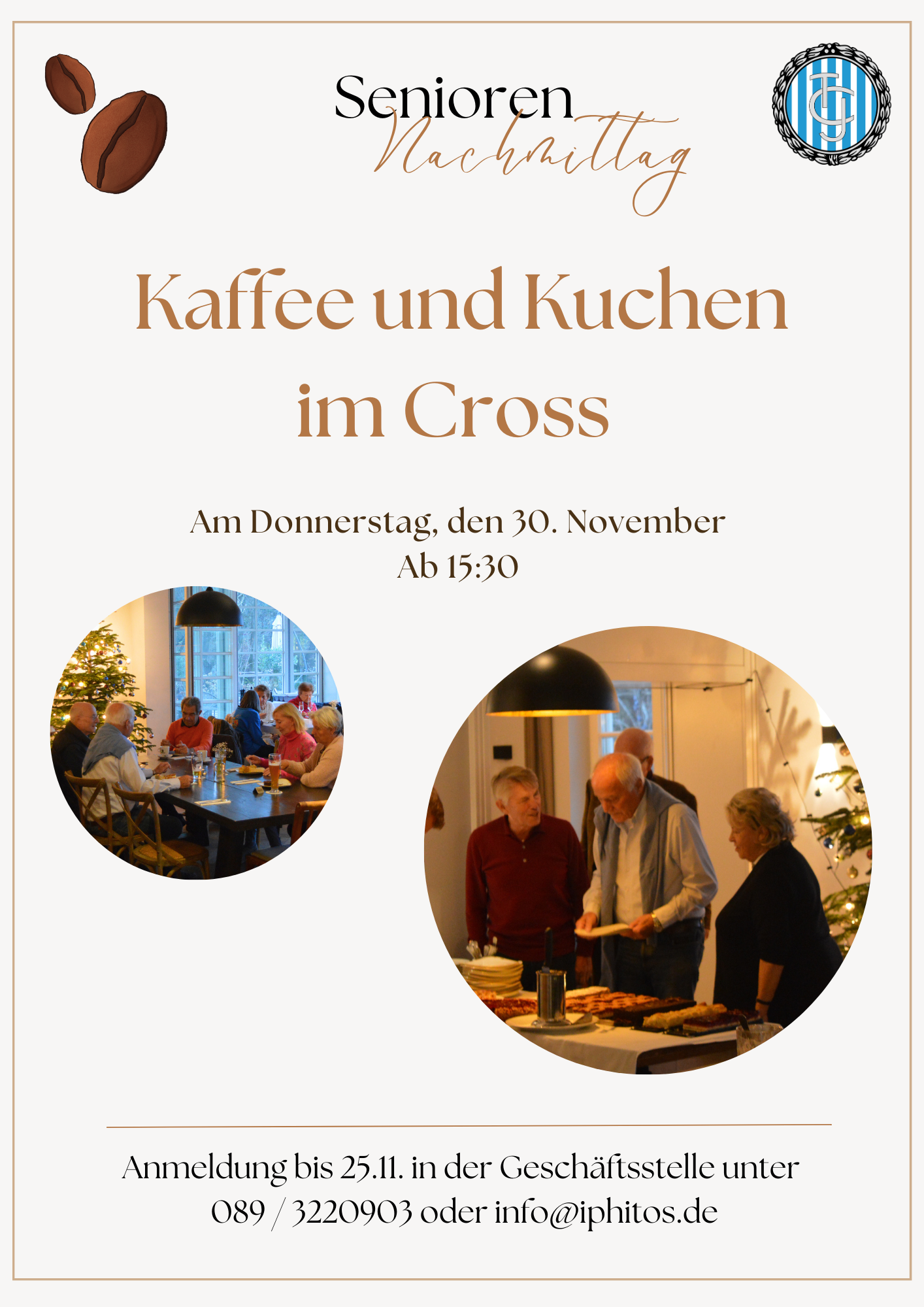 Wir freuen uns sehr, unsere immer noch sehr aktiven Iphitos Mitglieder ab 65 Jahren am 30. November 2023 ab 15:30 Uhr wieder zum alljährlichen Senioren Nachmittag im CROSS Restaurant einladen zu dürfen!