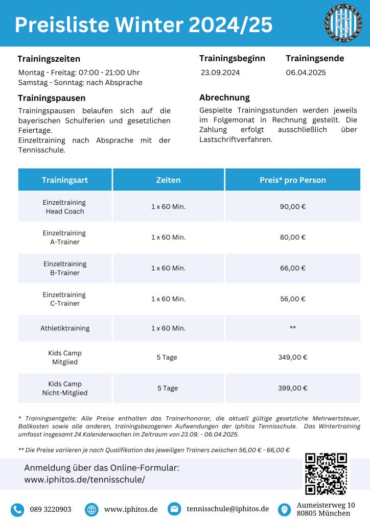 • Die Trainingsgebühren entnehmen Sie bitte der aktuellen Preisliste auf unserer Website oder dem beigefügten Flyer unserer Tennisschule.