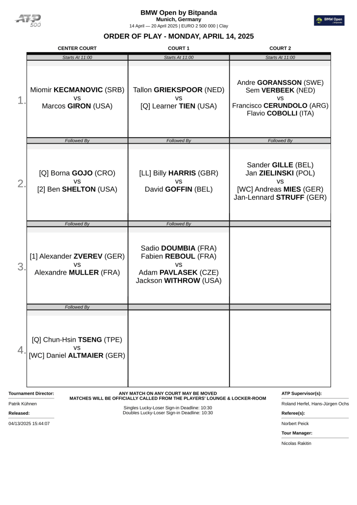 Order of play – 14.04.2025