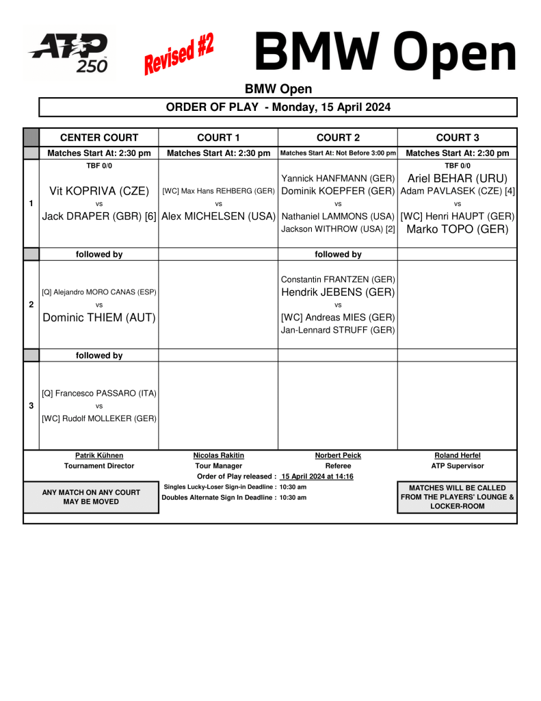 Update: Order of play – 15.04.2024