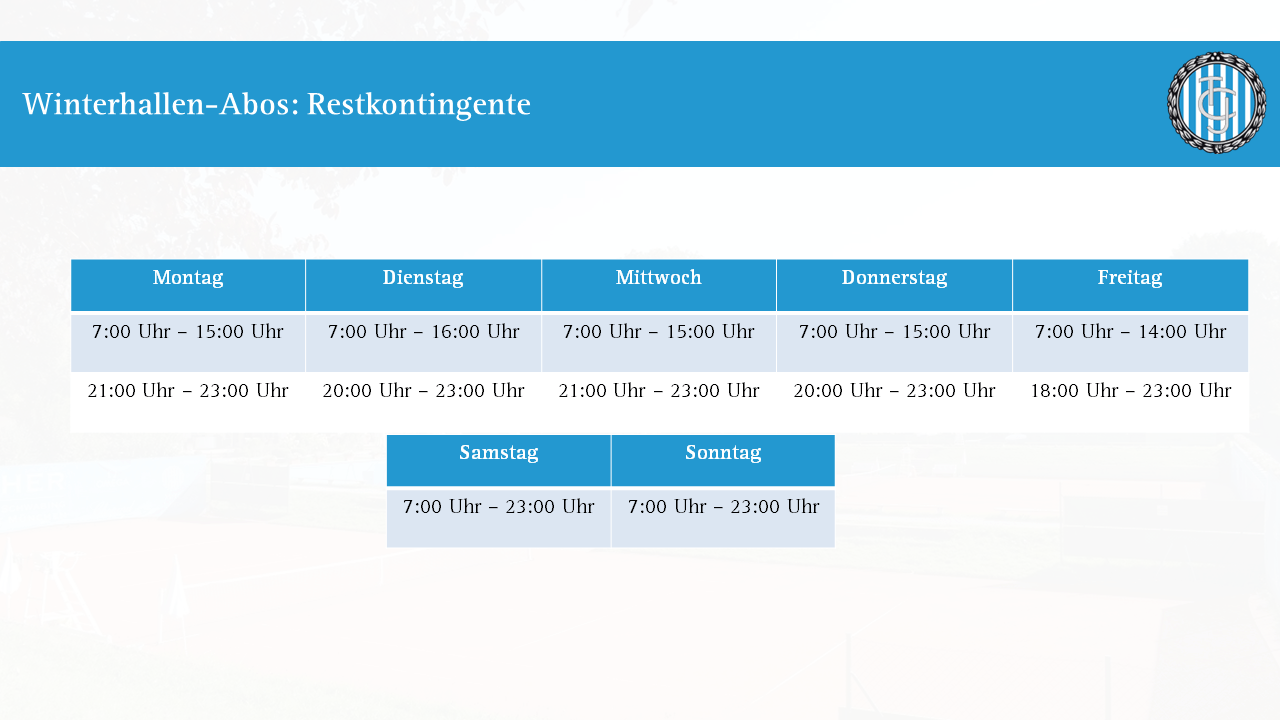 Sie haben noch kein Abo für die Winterhallensaison 2023/2024? Anbei finden Sie einen Überblick freier Zeitslots, in denen noch ein Abo erworben werden kann! Ihr Abonnement können Sie über die Geschäftsstelle via E-Mail an info@iphitos.de oder telefonisch unter 089 32 20 90 3 buchen. Sie können dann über die gesamte Wintersaison hinweg (25.09.2023 bis 17.03.2024, 25 Wochen) zu gewohnter Zeit auf gewohntem Platz spielen.